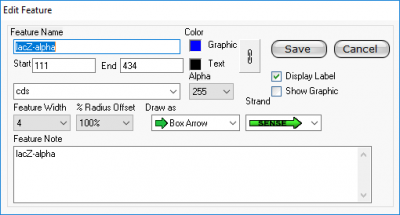 The feature editor window can be called by double clicking a feature on the map. From there, individual properties of the feature can be changed and the changes either saved or discarded by clicking the “Save” or “Cancel” buttons respectively.