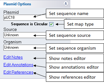 The detachable Tools window's top panel can be used to edit the properties of the project such as the sequence name, source and organism as well as to open editors for project references and notes.