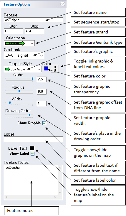 The detachable Feature Viewer window displays sequence information and translation of the feature currently selected by clicking it on the main map.